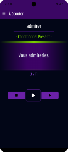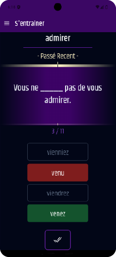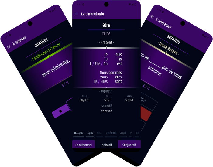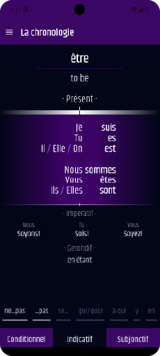 Effortlessly explore verbs across all major tenses — from past to present to future — with a simple swipe. See every conjugation laid out by pronoun, and switch tenses without ever breaking focus. It's intuitive, visual, and designed to make tense shifts finally make sense.